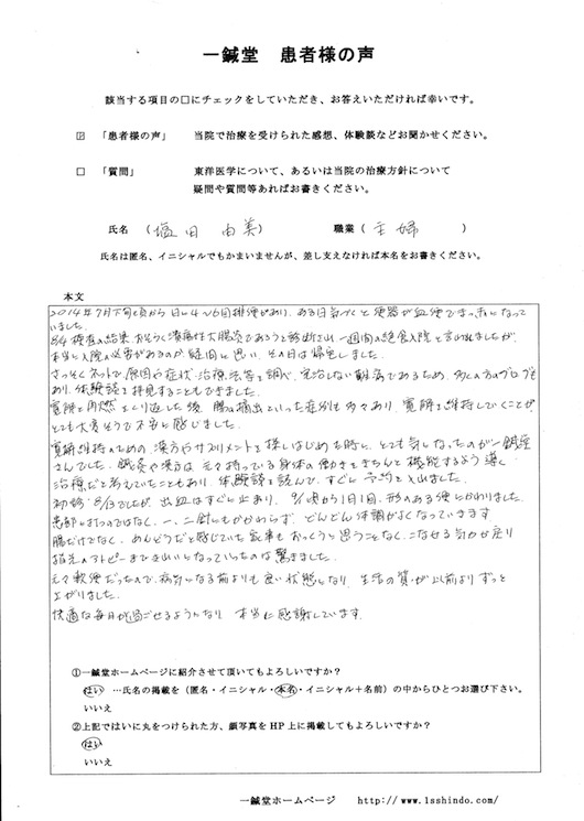 大阪市東淀川区の塩田 由美様の鍼灸治療体験談