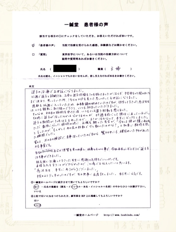 ホーム 体験談など 体験談・症例解説 【体験談】逆子(37週):大阪府豊中市のY.Y様 体験談・症例解説 【体験談】逆子(37週):大阪府豊中市のY.Y様 by tamezawa - 2016年1月22日 2201 0 Share Facebook Twitter ReddIt 逆子の鍼灸治療体験談に 大阪府豊中市のY.Y様の体験談を追加しました。 同じ症状で治らないと御悩みの方から 絶対克服したい方まで、 一人でも多くの方の参考になれば本望です。 【体験談】逆子(37週):大阪府豊中市のY.Y様 ※画像をクリックして頂くと掲載ページへ飛びます。 関連する記事同じ著者による投稿 一般・患者さん向け記事 【症例集】吐き気を伴う回転性の眩暈の鍼灸施療 一般・患者さん向け記事 【症例集】繰り返す痛風発作の鍼灸施療 一般・患者さん向け記事 【症例集】不妊症:大阪市西区のK.T様 返事を書く 返事をキャンセル Please enter your comment! Please enter your name here You have entered an incorrect email address! Please enter your email address here 最新記事一覧 風邪は万病の元 その1 2025年12月18日 【1/18公開臨床会】モデル患者・参加者募集中!! 2025年12月17日 守・破・離 2025年12月16日 多発性硬化症の方の首痛・不眠症状(症例-3242) 2025年12月15日 原因不明の手の痛みや強張り(症例-3241) 2025年12月15日 もっとロードする 人気の記事ランキング 私と北辰会の関係。 2018年8月22日 病歴フォーム 2011年2月23日 唾液づわり(唾液過多) 2013年5月9日 寺子屋プロジェクト(鍼灸臨床家育成プロジェクト)!! 2021年2月14日 「三焦」とは何を指すのか 2013年5月30日 もっとロードする 院長のオススメの記事 新しい修行生の紹介 2020年3月13日 興味はあるのですが迷っています【相談No.18】 2020年3月12日 当院の換気システムについて【コロナウイルス対策】 2020年3月12日 不安と相談【鍼灸業界相談No.19】 2020年9月19日 『黄帝内経 素問』の謎。 2019年12月14日