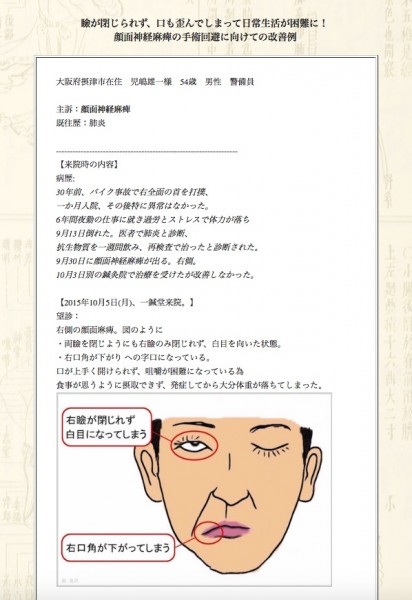 ホーム 体験談など 体験談・症例解説 【症例集】顔面神経麻痺:大阪府摂津市の児嶋雄一様 体験談・症例解説 【症例集】顔面神経麻痺:大阪府摂津市の児嶋雄一様 by tamezawa - 2016年5月9日 1589 0 Share Facebook Twitter ReddIt 顔面神経麻痺の鍼灸治療症例集に 大阪府摂津市の児嶋雄一様の症例を追加しました。 同じ病で治らないと御悩みの方から 絶対克服したい方まで、 一人でも多くの方の参考になれば本望です。 【症例集】顔面神経麻痺:大阪府摂津市の児嶋雄一様 ※画像をクリックして頂くと掲載ページへ飛びます。 関連する記事同じ著者による投稿 一般・患者さん向け記事 【症例集】吐き気を伴う回転性の眩暈の鍼灸施療 一般・患者さん向け記事 【症例集】繰り返す痛風発作の鍼灸施療 一般・患者さん向け記事 【症例集】不妊症:大阪市西区のK.T様 返事を書く 返事をキャンセル Please enter your comment! Please enter your name here You have entered an incorrect email address! Please enter your email address here 最新記事一覧 風邪は万病の元 その1 2025年12月18日 【1/18公開臨床会】モデル患者・参加者募集中!! 2025年12月17日 守・破・離 2025年12月16日 多発性硬化症の方の首痛・不眠症状(症例-3242) 2025年12月15日 原因不明の手の痛みや強張り(症例-3241) 2025年12月15日 もっとロードする 人気の記事ランキング 私と北辰会の関係。 2018年8月22日 病歴フォーム 2011年2月23日 唾液づわり(唾液過多) 2013年5月9日 寺子屋プロジェクト(鍼灸臨床家育成プロジェクト)!! 2021年2月14日 「三焦」とは何を指すのか 2013年5月30日 もっとロードする 院長のオススメの記事 『黄帝内経 素問』の謎。 2019年12月14日 当院の換気システムについて【コロナウイルス対策】 2020年3月12日 興味はあるのですが迷っています【相談No.18】 2020年3月12日 書籍『東洋医学考』発売!!! 2025年1月30日 新しい修行生の紹介 2020年3月13日