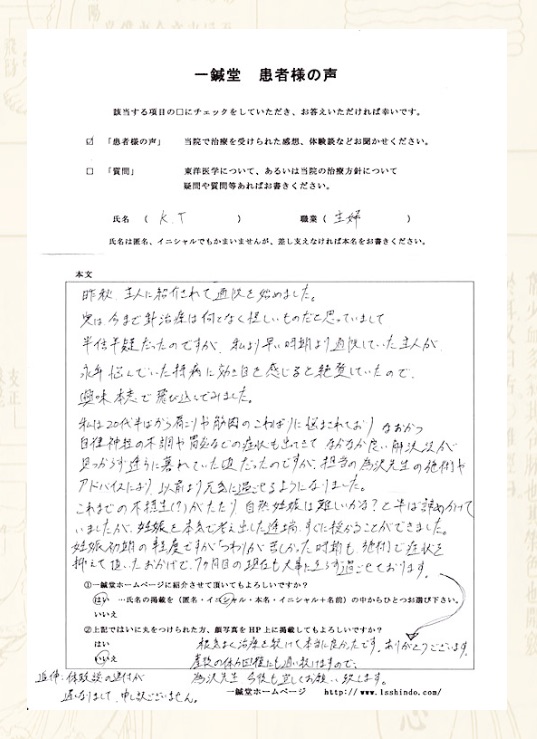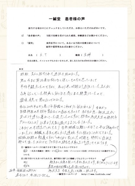 ホーム 体験談など 体験談・症例解説 【体験談】不妊症:兵庫県明石市のK.T様 体験談・症例解説 【体験談】不妊症:兵庫県明石市のK.T様 by tamezawa - 2016年7月8日 3013 0 Share Facebook Twitter ReddIt 【勉強生募集】 ①勉強生 ②受付スタッフ を若干数募集中です。詳しくはお問い合わせ下さい。 不妊症の鍼灸治療体験談に 兵庫県明石市のK.T様の体験談を追加しました。 同じ症状で治らないと御悩みの方から 絶対克服したい方まで、 一人でも多くの方の参考になれば本望です。 【体験談】不妊症:兵庫県明石市のK.T様 ※画像をクリックして頂くと掲載ページへ飛びます。 関連する記事同じ著者による投稿 一般・患者さん向け記事 【症例集】吐き気を伴う回転性の眩暈の鍼灸施療 一般・患者さん向け記事 【症例集】繰り返す痛風発作の鍼灸施療 一般・患者さん向け記事 【症例集】不妊症:大阪市西区のK.T様 返事を書く 返事をキャンセル Please enter your comment! Please enter your name here You have entered an incorrect email address! Please enter your email address here 最新記事一覧 風邪は万病の元 その1 2025年12月18日 【1/18公開臨床会】モデル患者・参加者募集中!! 2025年12月17日 守・破・離 2025年12月16日 多発性硬化症の方の首痛・不眠症状(症例-3242) 2025年12月15日 原因不明の手の痛みや強張り(症例-3241) 2025年12月15日 もっとロードする 人気の記事ランキング 私と北辰会の関係。 2018年8月22日 病歴フォーム 2011年2月23日 唾液づわり(唾液過多) 2013年5月9日 寺子屋プロジェクト(鍼灸臨床家育成プロジェクト)!! 2021年2月14日 「三焦」とは何を指すのか 2013年5月30日 もっとロードする 院長のオススメの記事 書籍『東洋医学考』発売!!! 2025年1月30日 不安と相談【鍼灸業界相談No.19】 2020年9月19日 興味はあるのですが迷っています【相談No.18】 2020年3月12日 『黄帝内経 素問』の謎。 2019年12月14日 新しい修行生の紹介 2020年3月13日
