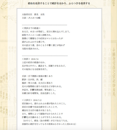 ホーム 体験談など 体験談・症例解説 【症例集】メニエール病:大阪府の匿名希望様 体験談・症例解説 【症例集】メニエール病:大阪府の匿名希望様 by ohara - 2016年9月2日 2249 0 Share Facebook Twitter ReddIt メニエールの鍼灸治療症例集に 大阪府の匿名希望様の症例を追加しました。 同じ病で治らないと御悩みの方から 絶対克服したい方まで、 一人でも多くの方の参考になれば本望です。 【症例集】メニエール病:大阪府の匿名希望様 ※画像をクリックして頂くと掲載ページへ飛びます。 関連する記事同じ著者による投稿 一般・患者さん向け記事 【症例集】吐き気を伴う回転性の眩暈の鍼灸施療 一般・患者さん向け記事 【症例集】繰り返す痛風発作の鍼灸施療 一般・患者さん向け記事 【症例集】不妊症:大阪市西区のK.T様 返事を書く 返事をキャンセル Please enter your comment! Please enter your name here You have entered an incorrect email address! Please enter your email address here 最新記事一覧 風邪は万病の元 その1 2025年12月18日 【1/18公開臨床会】モデル患者・参加者募集中!! 2025年12月17日 守・破・離 2025年12月16日 多発性硬化症の方の首痛・不眠症状(症例-3242) 2025年12月15日 原因不明の手の痛みや強張り(症例-3241) 2025年12月15日 もっとロードする 人気の記事ランキング 私と北辰会の関係。 2018年8月22日 病歴フォーム 2011年2月23日 唾液づわり(唾液過多) 2013年5月9日 寺子屋プロジェクト(鍼灸臨床家育成プロジェクト)!! 2021年2月14日 「三焦」とは何を指すのか 2013年5月30日 もっとロードする 院長のオススメの記事 当院の換気システムについて【コロナウイルス対策】 2020年3月12日 興味はあるのですが迷っています【相談No.18】 2020年3月12日 『黄帝内経 素問』の謎。 2019年12月14日 書籍『東洋医学考』発売!!! 2025年1月30日 新しい修行生の紹介 2020年3月13日