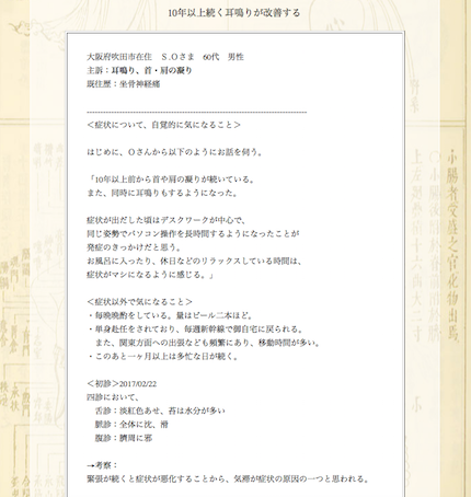 ホーム 体験談など 体験談・症例解説 【症例集】耳鳴り:大阪府吹田市のS.O様 体験談・症例解説 【症例集】耳鳴り:大阪府吹田市のS.O様 by ohara - 2017年4月11日 1532 0 Share Facebook Twitter ReddIt 耳鳴りの鍼灸症例集に 症例を追加しました。 同じ病で治らないと御悩みの方から 絶対克服したい方まで、 一人でも多くの方の参考になれば本望です。 【症例集】耳鳴り:大阪府吹田市のS.O様 ※画像をクリックして頂くと掲載ページへ飛びます。 関連する記事同じ著者による投稿 一般・患者さん向け記事 【症例集】吐き気を伴う回転性の眩暈の鍼灸施療 一般・患者さん向け記事 【症例集】繰り返す痛風発作の鍼灸施療 一般・患者さん向け記事 【症例集】不妊症:大阪市西区のK.T様 返事を書く 返事をキャンセル Please enter your comment! Please enter your name here You have entered an incorrect email address! Please enter your email address here 最新記事一覧 風邪は万病の元 その1 2025年12月18日 【1/18公開臨床会】モデル患者・参加者募集中!! 2025年12月17日 守・破・離 2025年12月16日 多発性硬化症の方の首痛・不眠症状(症例-3242) 2025年12月15日 原因不明の手の痛みや強張り(症例-3241) 2025年12月15日 もっとロードする 人気の記事ランキング 私と北辰会の関係。 2018年8月22日 病歴フォーム 2011年2月23日 唾液づわり(唾液過多) 2013年5月9日 寺子屋プロジェクト(鍼灸臨床家育成プロジェクト)!! 2021年2月14日 「三焦」とは何を指すのか 2013年5月30日 もっとロードする 院長のオススメの記事 『黄帝内経 素問』の謎。 2019年12月14日 不安と相談【鍼灸業界相談No.19】 2020年9月19日 興味はあるのですが迷っています【相談No.18】 2020年3月12日 当院の換気システムについて【コロナウイルス対策】 2020年3月12日 新しい修行生の紹介 2020年3月13日
