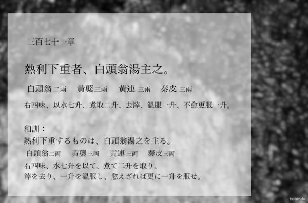 白頭翁二両 黄蘗三両 黄連三両 秦皮三両