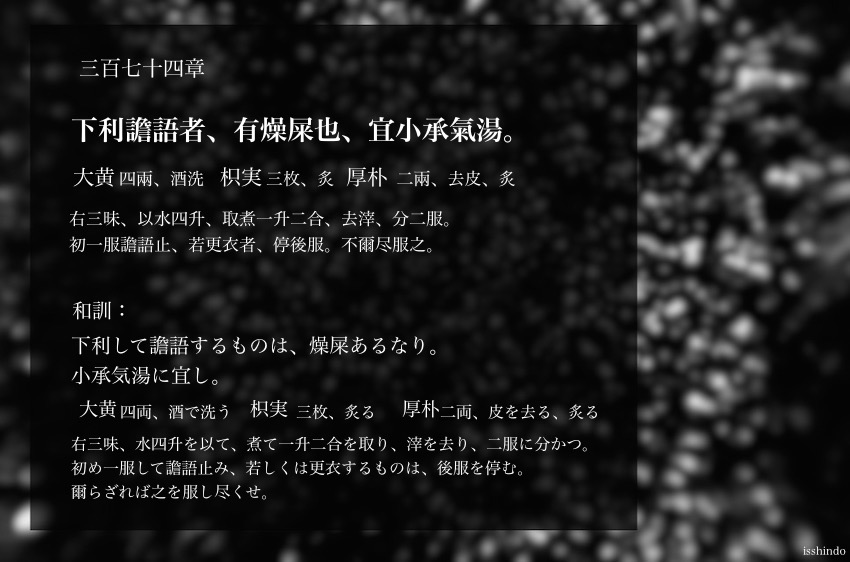 下痢があってしかも譫語を発していれば、体内に燥屎がある証拠で小承気湯で治療する。