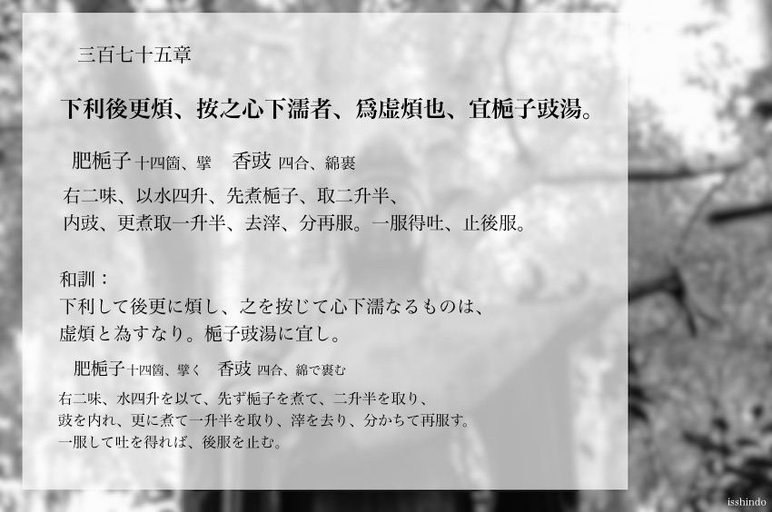 この章では、下痢後、虚煩が現れた場合の証治について詳しく述べております。
