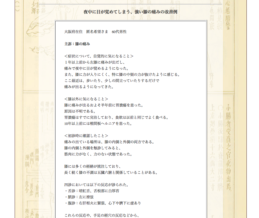 ホーム 体験談など 体験談・症例解説 【症例集】膝の痛み:大阪府の匿名希望様 体験談・症例解説 【症例集】膝の痛み:大阪府の匿名希望様 by ohara - 2018年3月6日 1677 0 Share Facebook Twitter ReddIt 膝痛の鍼灸治療症例集に 大阪府の匿名希望様の症例を追加しました。 同じ病で治らないと御悩みの方から 絶対克服したい方まで、 一人でも多くの方の参考になれば本望です。 【症例集】膝の痛み:大阪府の匿名希望様 ※画像をクリックして頂くと掲載ページへ飛びます。 関連する記事同じ著者による投稿 一般・患者さん向け記事 【症例集】吐き気を伴う回転性の眩暈の鍼灸施療 一般・患者さん向け記事 【症例集】繰り返す痛風発作の鍼灸施療 一般・患者さん向け記事 【症例集】不妊症:大阪市西区のK.T様 返事を書く 返事をキャンセル Please enter your comment! Please enter your name here You have entered an incorrect email address! Please enter your email address here 最新記事一覧 風邪は万病の元 その1 2025年12月18日 【1/18公開臨床会】モデル患者・参加者募集中!! 2025年12月17日 守・破・離 2025年12月16日 多発性硬化症の方の首痛・不眠症状(症例-3242) 2025年12月15日 原因不明の手の痛みや強張り(症例-3241) 2025年12月15日 もっとロードする 人気の記事ランキング 私と北辰会の関係。 2018年8月22日 病歴フォーム 2011年2月23日 唾液づわり(唾液過多) 2013年5月9日 寺子屋プロジェクト(鍼灸臨床家育成プロジェクト)!! 2021年2月14日 「三焦」とは何を指すのか 2013年5月30日 もっとロードする 院長のオススメの記事 『黄帝内経 素問』の謎。 2019年12月14日 不安と相談【鍼灸業界相談No.19】 2020年9月19日 新しい修行生の紹介 2020年3月13日 書籍『東洋医学考』発売!!! 2025年1月30日 興味はあるのですが迷っています【相談No.18】 2020年3月12日