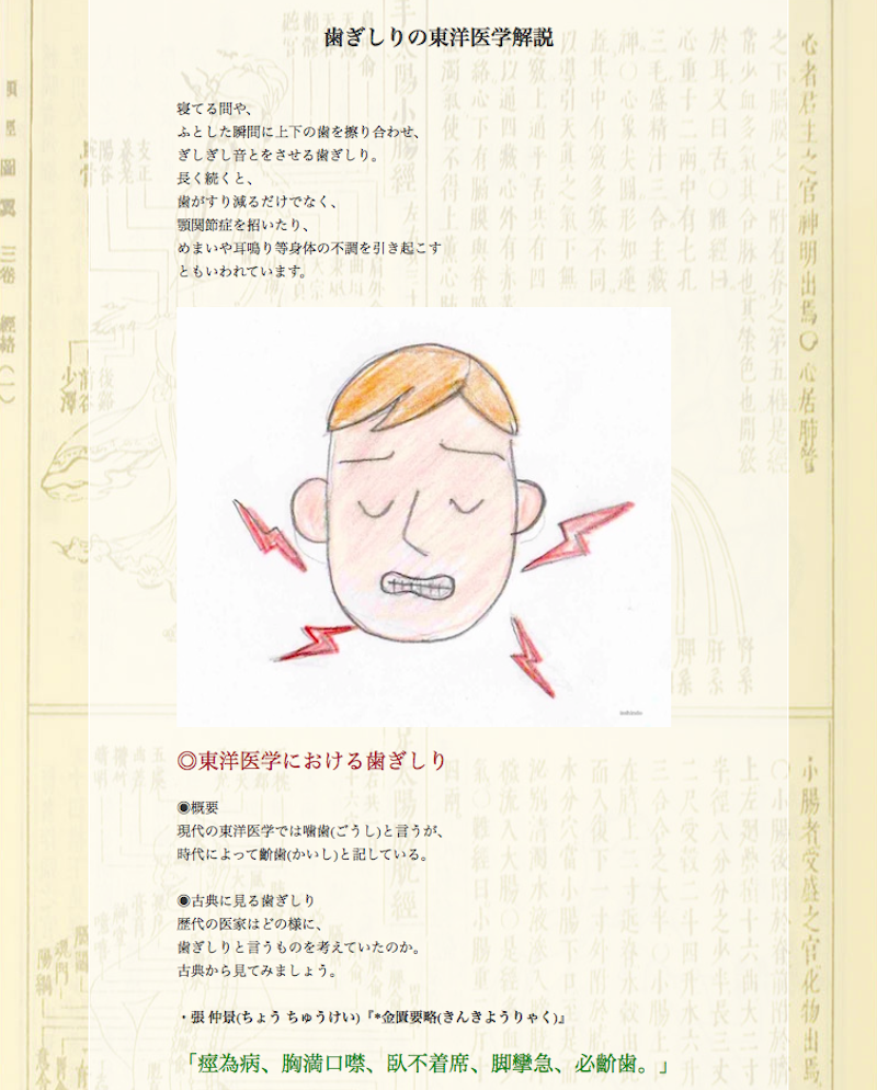 ホーム 体験談など 疾患別解説 【疾患別解説】歯ぎしり 疾患別解説 【疾患別解説】歯ぎしり by 一鍼堂 - 2018年5月31日 1824 0 Share Facebook Twitter ReddIt 疾患別解説に歯ぎしりの解説を追加しました。 同じ病で治らないとお悩みの方から 絶対克服したい方まで、 一人でも多くの方の参考になれば本望です。 【疾患別解説】歯ぎしり ※画像をクリックして頂くと掲載ページへ飛びます。 関連する記事同じ著者による投稿 一般・患者さん向け記事 お灸での施療がmustなのか。 疾患別解説 【疾患別解説】酒さ鼻 疾患別解説 【疾患別解説】白内障 返事を書く 返事をキャンセル Please enter your comment! Please enter your name here You have entered an incorrect email address! Please enter your email address here 最新記事一覧 難経の注釈書『難経本義』 その2 2025年12月4日 ばね指(症例-3239) 2025年12月3日 細心でありながらも大胆に、知識はかけることなくその行いは正しく真面目であれ 2025年12月2日 【神戸院】診療時間の変更について 2025年11月30日 インフルエンザについて 2025年11月29日 もっとロードする 人気の記事ランキング 私と北辰会の関係。 2018年8月22日 病歴フォーム 2011年2月23日 唾液づわり(唾液過多) 2013年5月9日 寺子屋プロジェクト(鍼灸臨床家育成プロジェクト)!! 2021年2月14日 「三焦」とは何を指すのか 2013年5月30日 もっとロードする 院長のオススメの記事 興味はあるのですが迷っています【相談No.18】 2020年3月12日 不安と相談【鍼灸業界相談No.19】 2020年9月19日 『黄帝内経 素問』の謎。 2019年12月14日 新しい修行生の紹介 2020年3月13日 書籍『東洋医学考』発売!!! 2025年1月30日