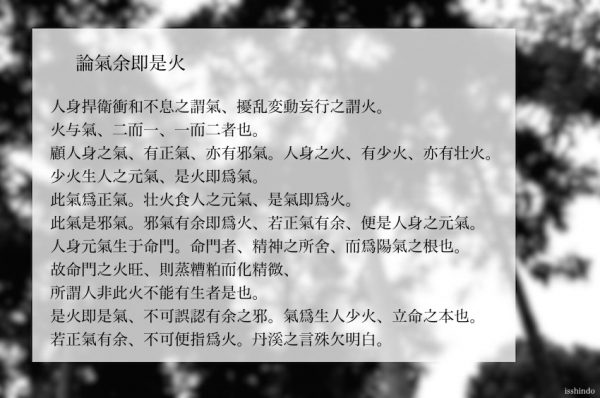 今回は張景岳ちょうけいがくの『質疑録しつぎろく』の第十四章「論氣余即是火」です。