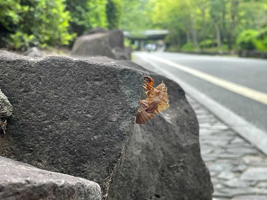 上の写真は緑道の脇、石垣に見つけた抜け殻です。
