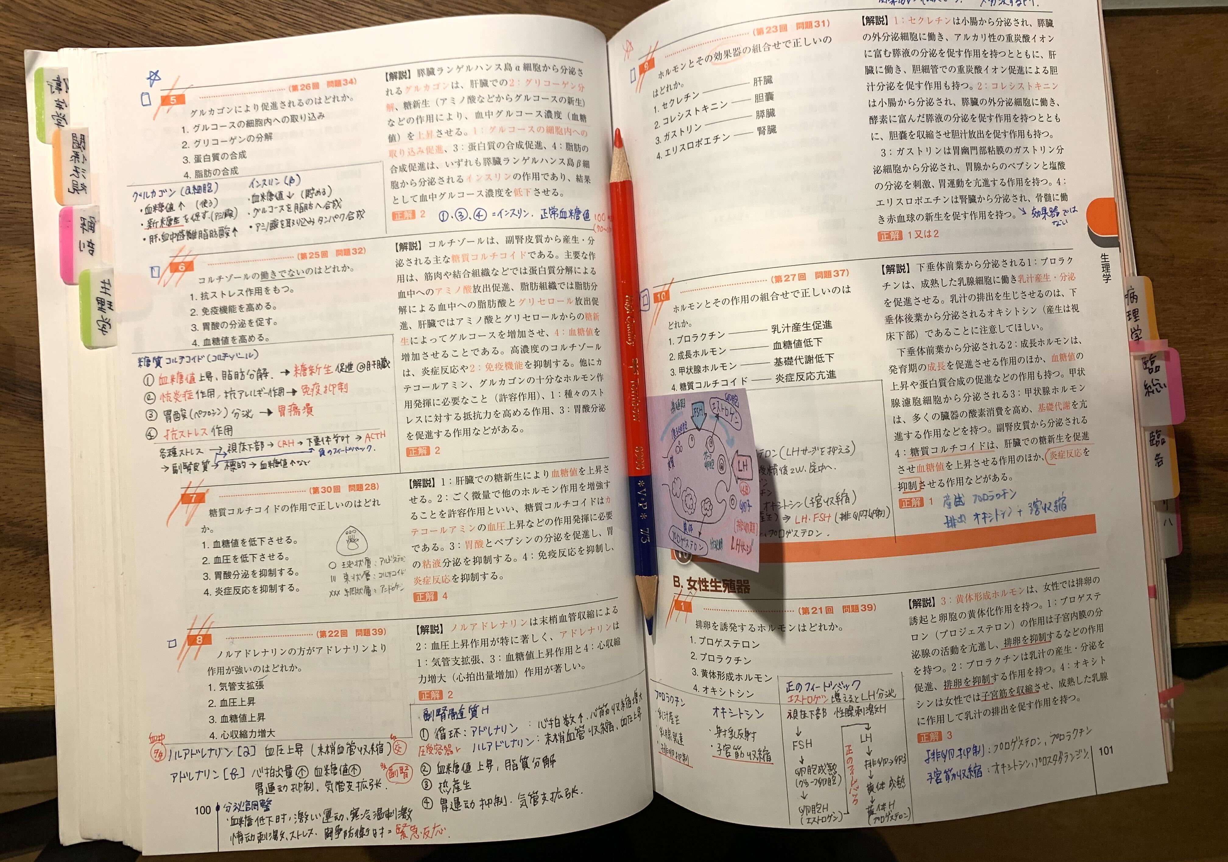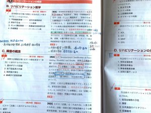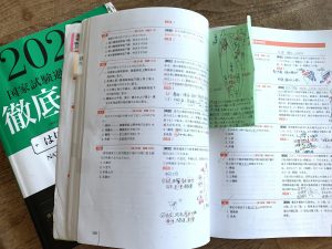 国試の勉強は教科書や筆記用具で机の上がいっぱいになります。