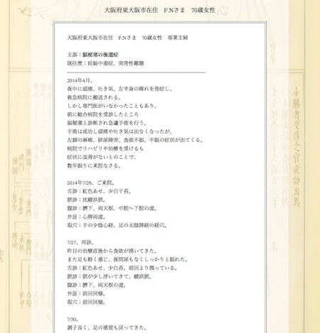 ホーム 治療家日記 下野 【症例集】脳梗塞後の後遺症:東大阪市のF.N様 下野体験談・症例解説 【症例集】脳梗塞後の後遺症:東大阪市のF.N様 by shimono - 2014年8月19日 1640 0 Share Facebook Twitter ReddIt 脳梗塞後の後遺症の鍼灸治療症例集に 大阪府東大阪市のF.N様の症例を追加しました。 同じ病で治らないと御悩みの方から 絶対克服したい方まで、 一人でも多くの方の参考になれば本望です。 【症例集】脳梗塞後の後遺症:大阪府東大阪市ののF.N様 ※画像をクリックして頂くと掲載ページへ飛びます。 関連する記事同じ著者による投稿 一般・患者さん向け記事 ミートポイントの変更 下野 AIを利用しての古典翻訳 一般・患者さん向け記事 【症例集】吐き気を伴う回転性の眩暈の鍼灸施療 返事を書く 返事をキャンセル Please enter your comment! Please enter your name here You have entered an incorrect email address! Please enter your email address here 最新記事一覧 難経の注釈書『難経本義』 その2 2025年12月4日 ばね指(症例-3239) 2025年12月3日 細心でありながらも大胆に、知識はかけることなくその行いは正しく真面目であれ 2025年12月2日 【神戸院】診療時間の変更について 2025年11月30日 インフルエンザについて 2025年11月29日 もっとロードする 人気の記事ランキング 私と北辰会の関係。 2018年8月22日 病歴フォーム 2011年2月23日 唾液づわり(唾液過多) 2013年5月9日 寺子屋プロジェクト(鍼灸臨床家育成プロジェクト)!! 2021年2月14日 「三焦」とは何を指すのか 2013年5月30日 もっとロードする 院長のオススメの記事 当院の換気システムについて【コロナウイルス対策】 2020年3月12日 『黄帝内経 素問』の謎。 2019年12月14日 書籍『東洋医学考』発売!!! 2025年1月30日 不安と相談【鍼灸業界相談No.19】 2020年9月19日 新しい修行生の紹介 2020年3月13日