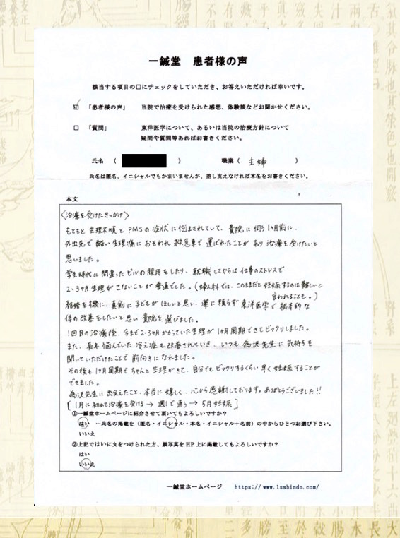 月経不順でお悩みの大阪府柏原市のY.I様の鍼灸施療体験談です。