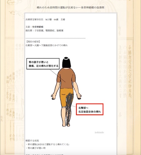 坐骨神経痛でお悩みの兵庫県宝塚市のM.T様の鍼灸治療症例集です。