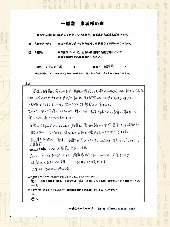 腰痛・脚の痺れでお悩みの兵庫県尼崎市の松田千春様の鍼灸治療体験談です。