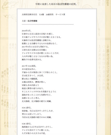 低音性難聴でお悩みの兵庫県尼崎市のT.H様の鍼灸治療症例集です。