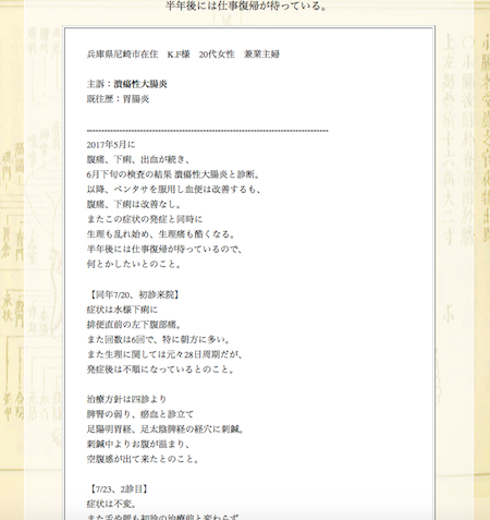 潰瘍性大腸炎でお悩みの兵庫県尼崎市のK.F様の鍼灸治療症例集です。