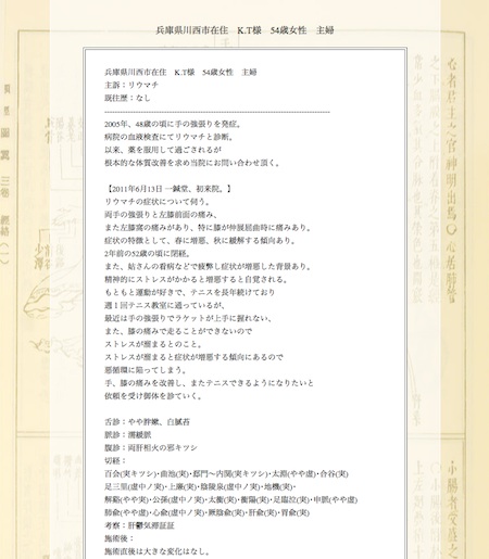 リウマチでお悩みの兵庫県川西市のK.T様の鍼灸治療症例集です。