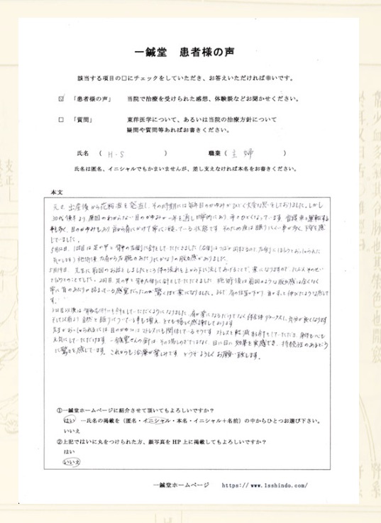頚の凝り・眼精疲労・花粉症でお悩みの兵庫県西宮市のH.S様の鍼灸治療体験談です。
