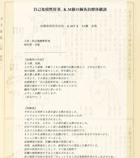 自己免疫性肝炎を改善された兵庫県西宮市のK.Mさまの鍼灸治療体験談です。