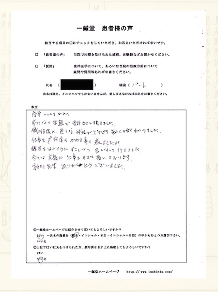 坐骨神経痛でお悩みの大阪府枚方市のH.U様の鍼灸治療体験談です。