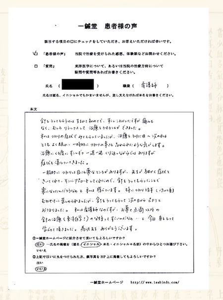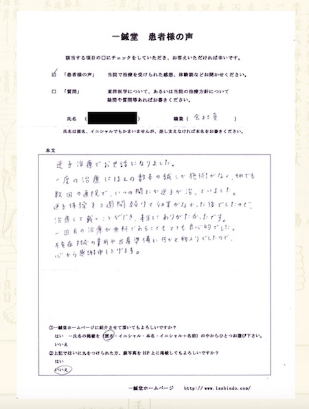 潰瘍性大腸炎でお悩みの大阪市城東区のT.F様の鍼灸治療体験談です。