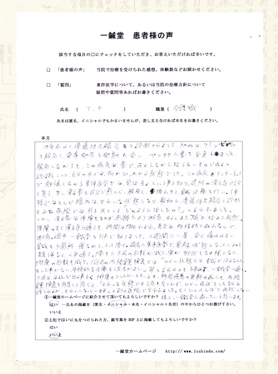 潰瘍性大腸炎でお悩みの大阪市城東区のT.F様の卒業報告です。