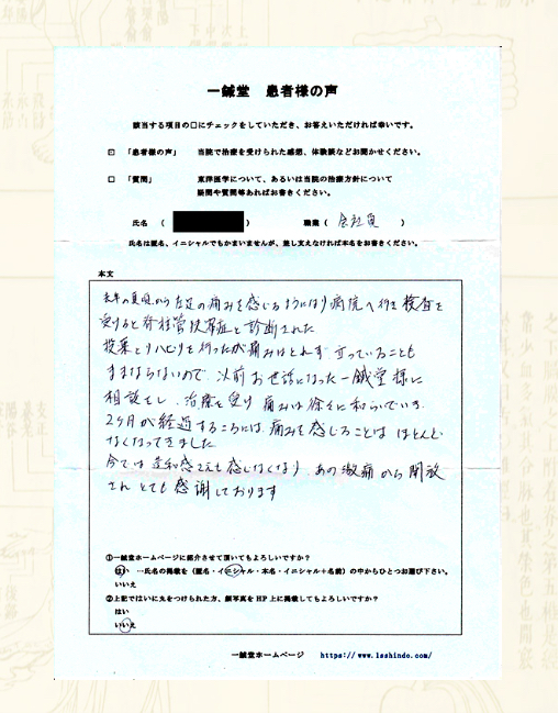 腰部脊柱管狭窄症でお悩みの大阪市鶴見区のY.F様の鍼灸治療体験談です。
