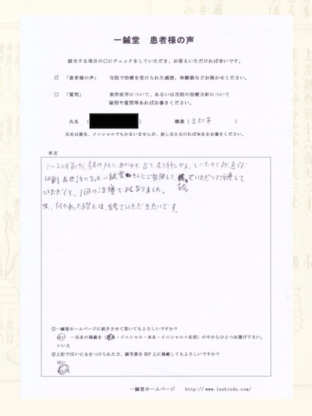 顔面の紅斑でお悩みの大阪府和泉市の匿名希望さまの鍼灸治療体験談です。