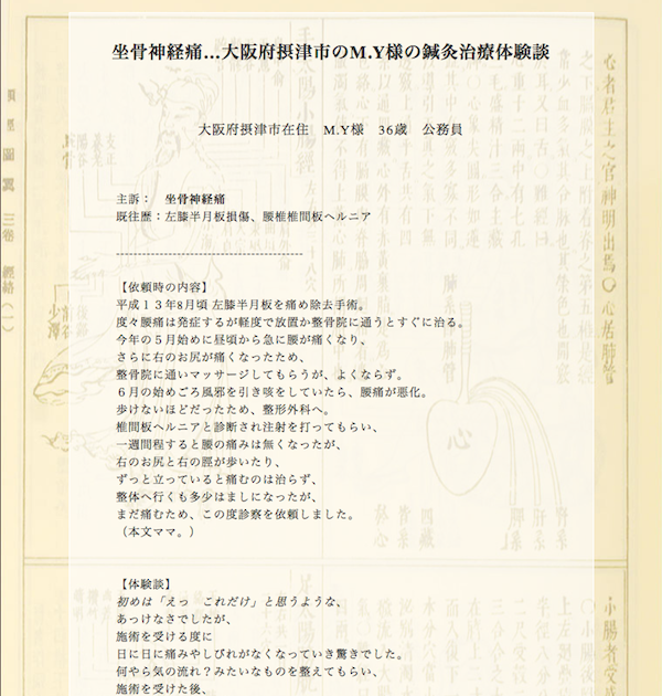 坐骨神経痛を改善された大阪府摂津市のM.Y様の鍼灸治療体験談です