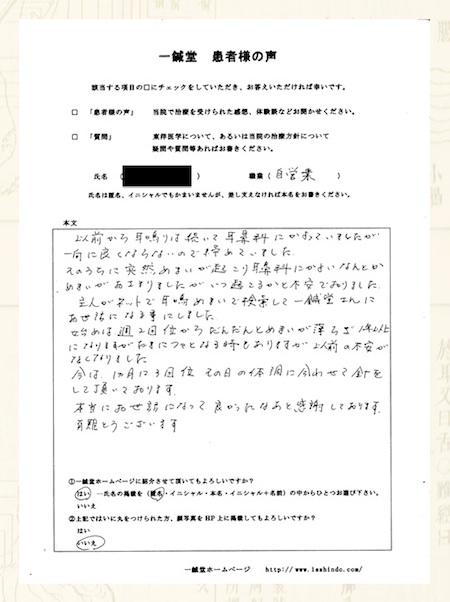メニエール病でお悩みの大阪府摂津市の匿名希望様の鍼灸治療体験談です。