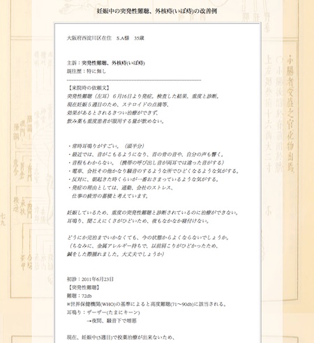 【症例集】突発性難聴、外核痔(いぼ痔):大阪府西淀川区のS.A様