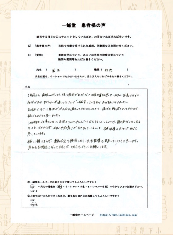 耳鳴・眩暈・喉の異物感でお悩みの大阪府高槻市の匿名希望様の鍼灸治療体験談です。