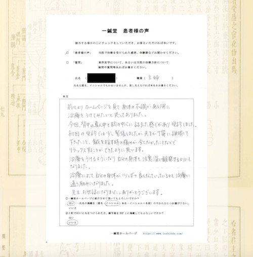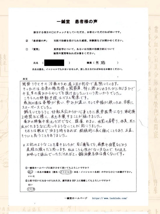 リウマチでお悩みの大阪府高槻市のH.T様の鍼灸治療体験談です。