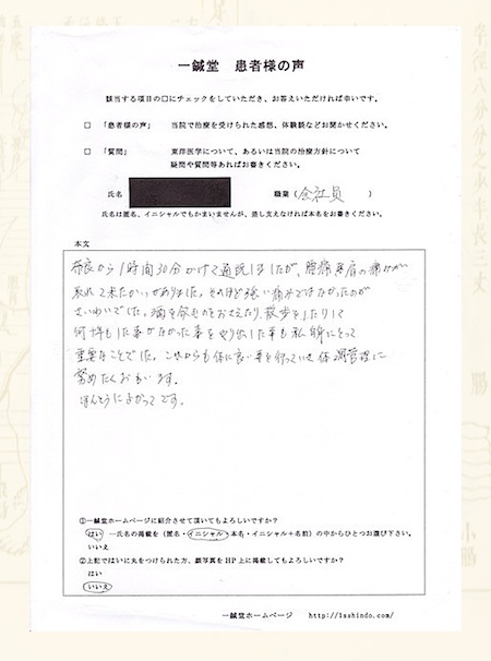 腰痛でお悩みの奈良県大和郡山市のY.O様の鍼灸治療体験談です。