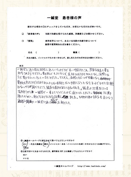 大阪府河内長野市在住のR.Tさま(担当鍼灸師:為沢)