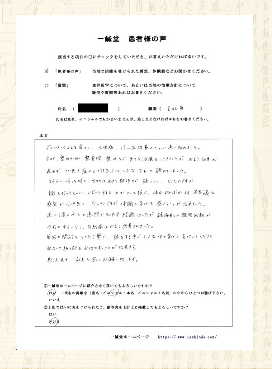 生理痛・冷え症・肩凝りでお悩みの大阪府富田林市のM.Y様の鍼灸治療症例集です。