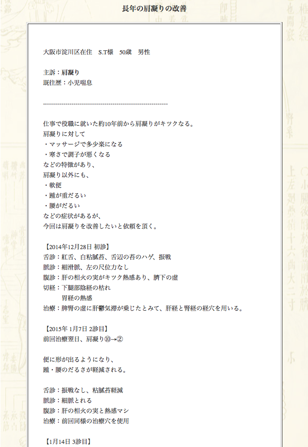肩凝りでお悩みの大阪市淀川区のS.T様の鍼灸治療症例集です。