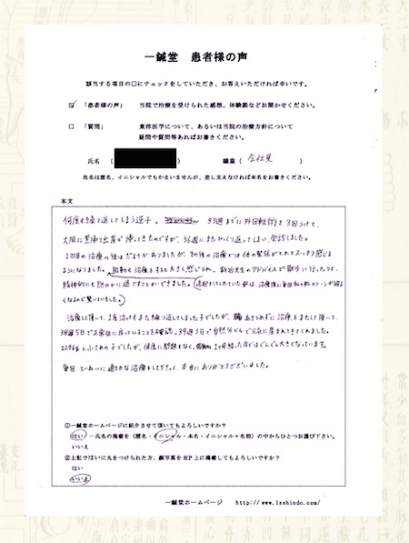 逆子(32週)でお悩みの大阪府茨木市の匿名希望様の鍼灸治療体験談です。