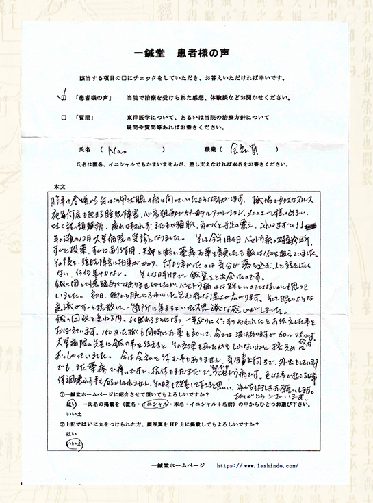 バセドウ病でお悩みの大阪府高槻市のNao様の鍼灸治療体験談です。