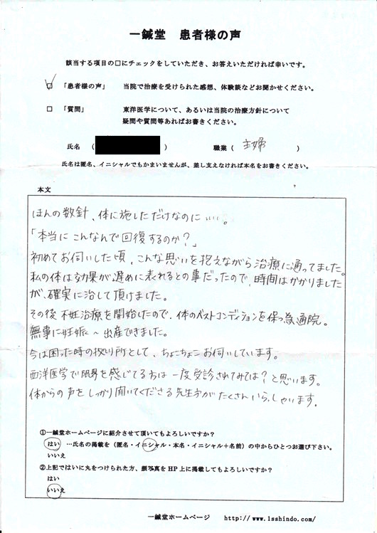 ほんの数針、体に施しただけなのに…。 「本当にこんなんで回復するのか?」 初めてお伺いした頃、こんな思いを抱えながら治療に通ってました。 私の体は効果が遅めに表れるとの事だったので 時間はかかりましたが、確実に治して頂けました。 その後 不妊治療を開始したので、 体のベストコンディションを保つ為、通院。 無事に妊娠~出産できました。