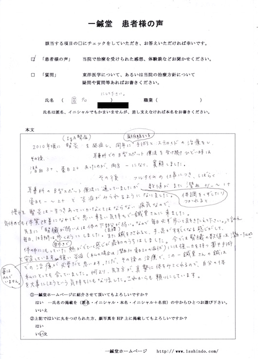 【体験談】 2010年頃に腎炎(IgA腎症)を発症し、 同年に扁桃腺をとる手術とステロイドの治療をし、 その後、耳鼻科でのBスポット療法を受け続け ひどい時は潜血3+、蛋白2+あったのが、 両方-になり、寛解しました。 その後フルタイムの仕事につき、 しばらく耳鼻科のB型スポット療法に通ってましたが 体調をくずしたり、つかれると数値がまた潜血±~1+、 蛋白も-~2+と炎症がみられるようになりました。 慢性腎炎は一生つきあっていかなくてはならない 病気なので気休めも体質改善になればと思い 軽い気持ちで一鍼堂さんに来ました。