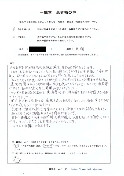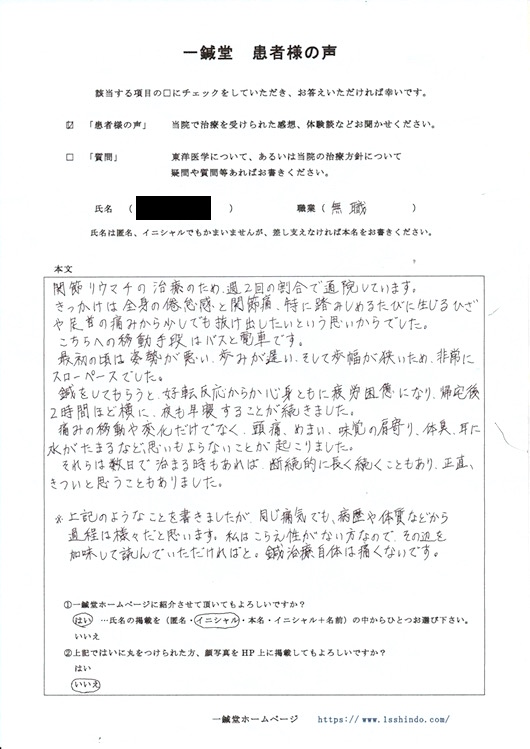 リウマチ…大阪府高槻市のH.T様の鍼灸治療体験談