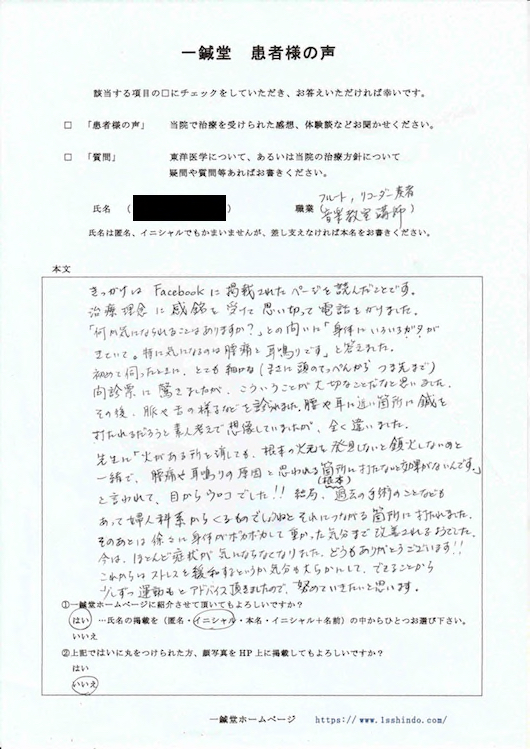 きっかけはFacebookに掲載されたページを読んだことです。 治療理念に感銘を受けて思い切って電話をかけました。 「何か気になられることはありますか?」との問いに 「身体にいろいろガタがきていて。 特に気になるのは腰痛と耳鳴りです」と答えました。