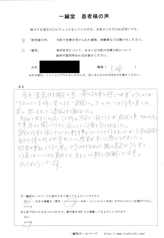 【体験談】 長年潰瘍性大腸炎を患い、薬の効果も感じられず、 どうしようかと悩んでいる時に見つけた一鍼堂さん。 ホームページを何度も見ては考え、 思い切ってご連絡させて頂きました。 初めて先生にお会いした時は不安で一杯でしたが 病状の事、それ以外の事、色々と聞いて下さり 安心して治療を受けられました。