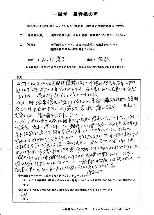 2016年1月に次女の処に用事で来た処 疲れが出て ヘトヘトになり・・ 一鍼堂に連れて行ってくれ・・。 治療をして頂いた処、 その晩、右耳から鼻に血流が流れている様な感じを生じ・・ ビックリしました。 それから耳鳴りはガアガアからズウズウになり・・今はスウスウに。 耳の傍の頭を手でこする音も右耳から聴こえる様になりました。 腰はスーと楽になり 一日、8000歩歩き乍ら買い物に行き重い荷物もさげて 帰れるようになりました。 帰宅するなり立ち仕事(料理)をするので、 無理を重なったのか、又少し痛みを感じるようになりましたが・・ 一鍼堂様の治療には驚くばかり−有り難い事です。 友人等で困っている人達に伝えてあげるつもりです。 御礼まで